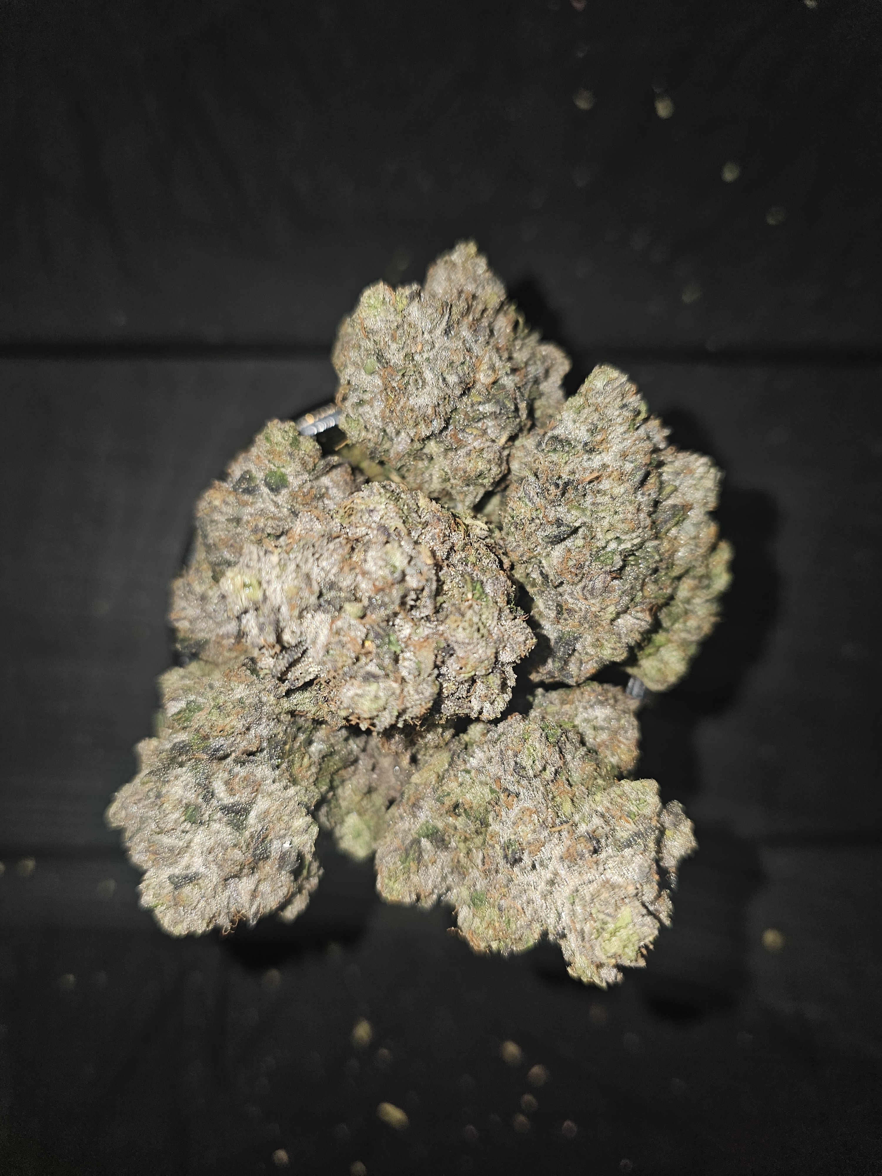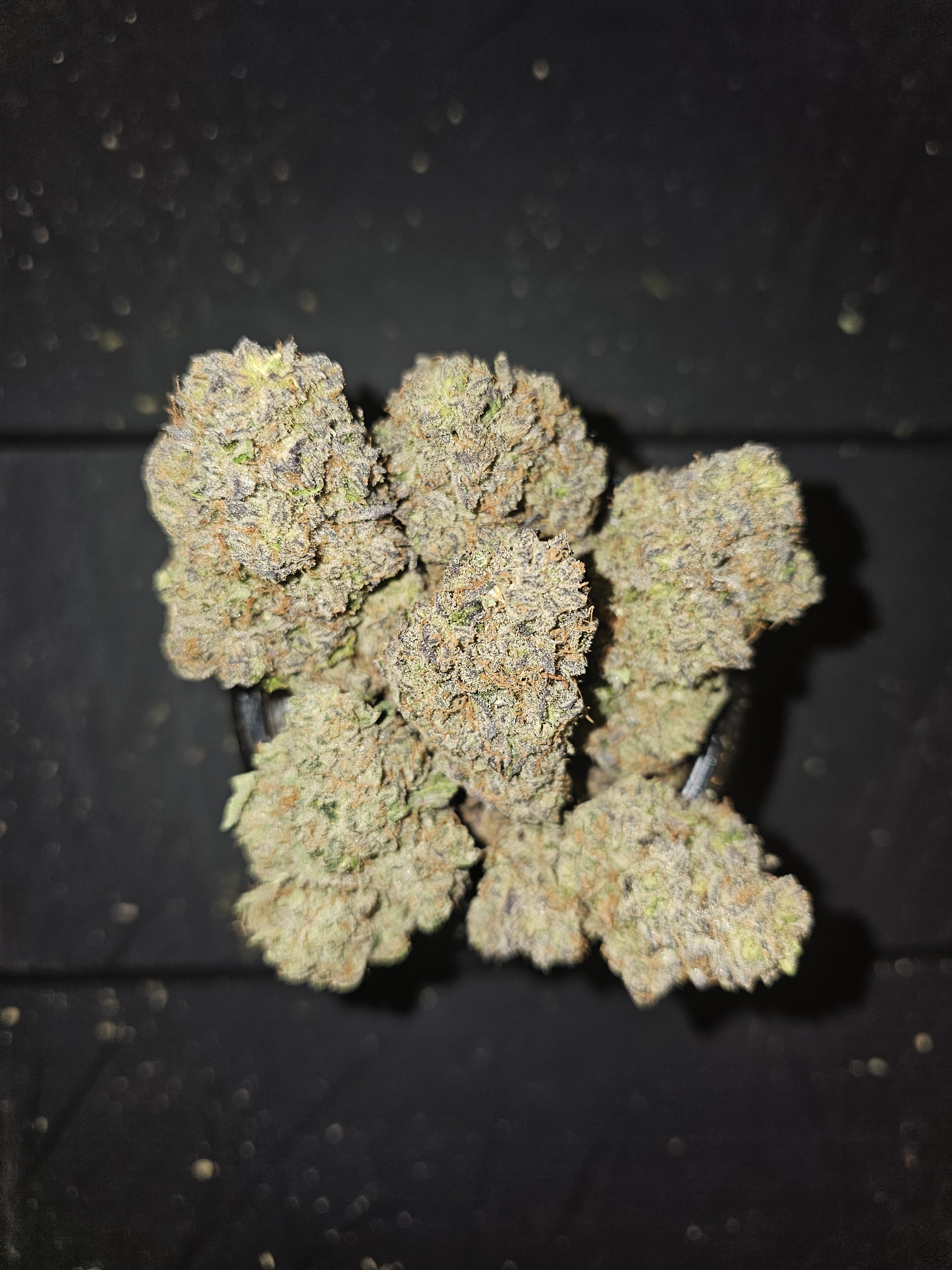 Grape Biscotti is a rare indica dominant hybrid strain (70% indica/30% sativa) created through crossing the powerful Green Crack X Gas strains. This celebrity child packs a super high potency level that will knock you flat out before you even realize what's happening. The high comes on fast and hard with a lifted sense that fills you with an expansive euphoria, pushing out any negative or racing thoughts with ease. This state quickly takes a heady turn, leaving you completely unfocused and pretty sedated at times. A relaxing body high accompanies this heady state, helping you stretch out and kick back before you finally fade away into a long and peaceful sleep. In combination with its super high 27-33% average THC level, these effects make Grape Biscotti a great choice for treating patients suffering from depression, PTSD, chronic pain, mood swings and chronic stress. This bud has a sour and spicy citrusy woody flavor with a slightly earthy exhale. The aroma is heavy and pungent with a super dank and spicy citrusy lemon stench that fills any room. Grape Biscotti buds have small rounded minty green nugs with thin orange hairs, dark leaves and a coating of tiny white crystal trichomes.