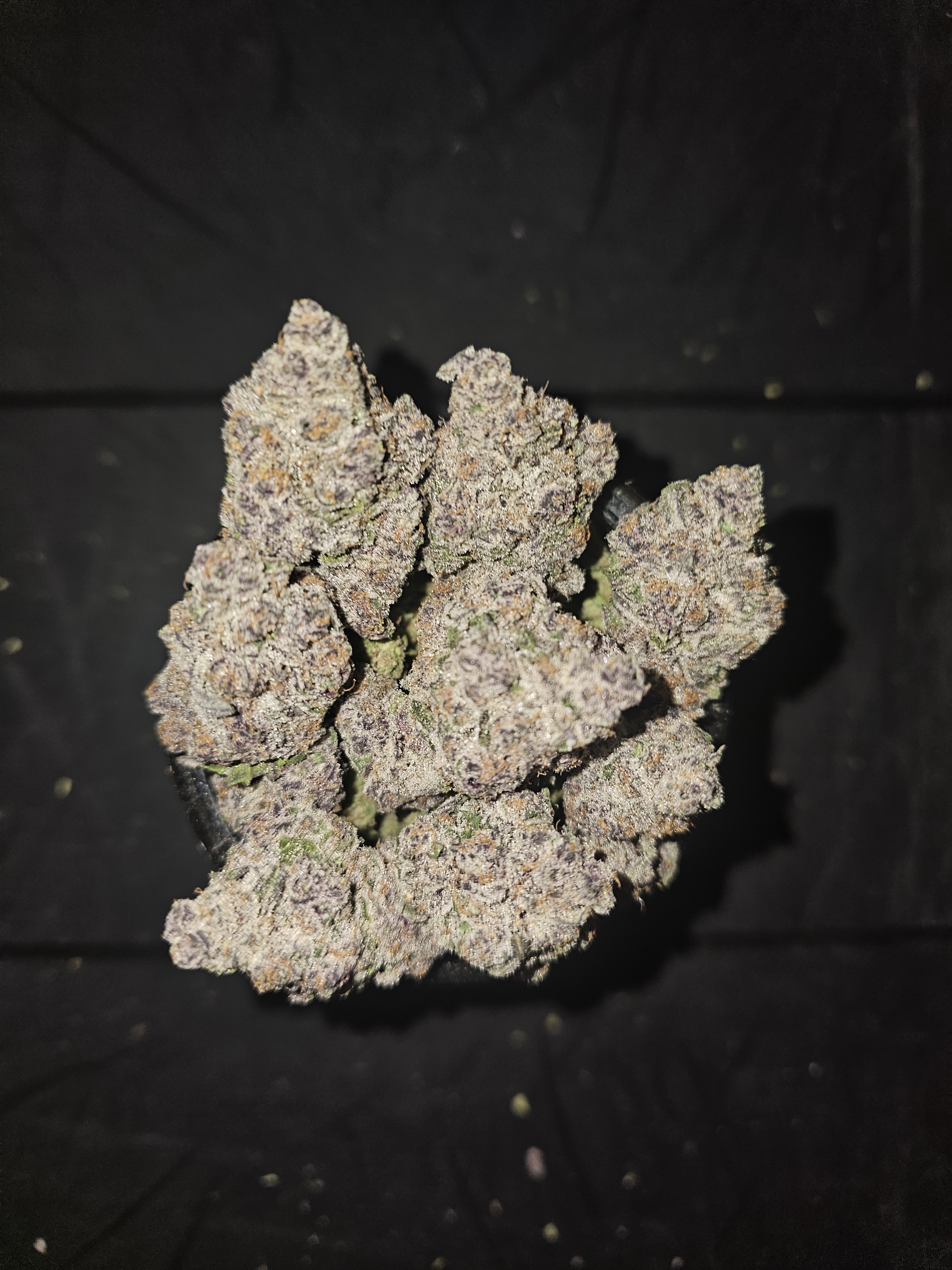 Blueberry Fritter is an evenly balanced hybrid strain (50% indica/50% sativa) created through crossing the diecious Blueberry X Apple Fritter strains. If you're a super fan of fruity hybrids and appreciate a true full-bodied high, Blueberry Fritter might just be the right strain for you to try next. The flavor of Blueberry Fritter is exactly what you'd guess, with hints of creamy, doughy pastries accented by sugary blueberries and a touch of sour apples. The aroma is very similar, almost like you're enjoying a fresh blueberry fritter and apple fritter blended into one. The Blueberry Fritter high will hit you fairly quickly, rushing into your mind after your final toke with a sense of lifted euphoria. As your mind flies higher and higher into this happy place, you'll find that you're filled with a boost in sociability that has you feeling outgoing and ready to laugh with anyone around you. Thanks to these bright effects and its insanely high 30-33% average THC level, Blueberry Fritter is often chosen to treat a wide variety of conditions including chronic pain, depression, cramps or muscle spasms, chronic stress and nausea or appetite loss. This bud has fluffy and oversized, spade-shaped forest green nugs with bright purple undertones, thick orange hairs and chunky, golden-white crystal trichomes.